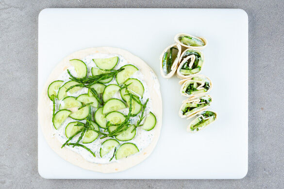 4 Tortillas mit der Meerrettichcreme bestreichen, dann mit den Gurken und dem Queller belegen. Die Tortillas aufrollen, mit der Naht nach unten nebeneinander legen und in ca. 2cm breite Tortillarollen schneiden. Die Tortillarollen und die Hackbällchen auf Tellern anrichten, jeweils mit einem Zahnstocher aufnehmen und mit dem Dip servieren.