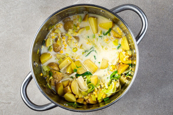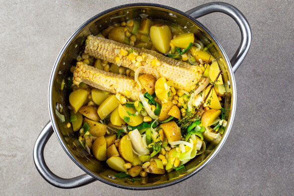 Die Kartoffeln, den Maiskolben, das Brühgewürz und 600ml Wasser hinzufügen, aufkochen und dann bei mittlerer Hitze abgedeckt 13–15Min. köcheln lassen, bis die Kartoffeln gar sind.