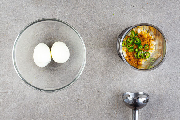 Die Zwiebeln, die Peperoni und die Currypaste mit 2EL Pflanzenöl in einem hohen Gefäß mit einem Stabmixer grob pürieren. Die Eier in das kochende Wasser geben und in ca. 9Min. hart kochen. Vorsichtig abgießen, kalt abschrecken und schälen.