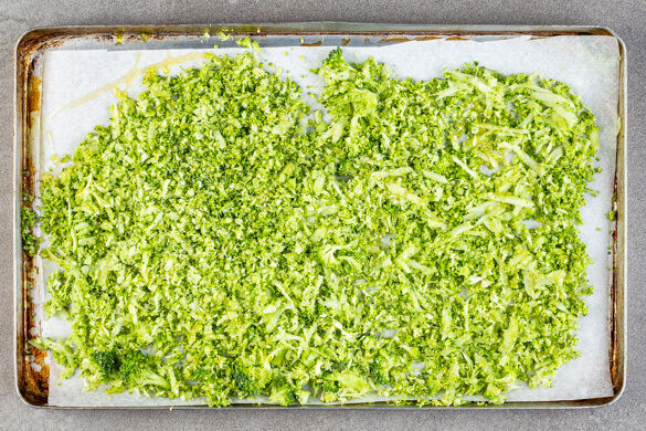 Den Brokkoli grob raspeln und mit 1EL Pflanzenöl und je 1 kräftigen Prise Salz und Pfeffer auf einem mit Backpapier ausgelegten Backblech vermengen. Gleichmäßig verteilen und ca. 8Min. im Ofen backen, bis der Brokkolireis an den Rändern leicht braun ist.
