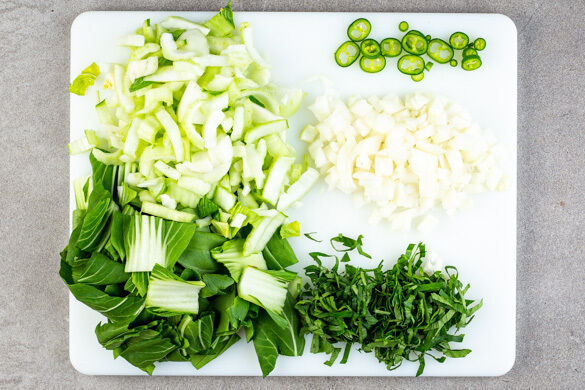 Den Backofen auf 240°C (220°C Umluft) vorheizen. In einem mittelgroßen Topf ausreichend Wasser für die Eier zum Kochen bringen. Den Pak Choi vom Strunk befreien, dann den weißen Teil in ca. 1cm breite Streifen, den grünen Teil in ca. 3cm breite Streifen schneiden. Die Zwiebel schälen und grob würfeln, die Peperoni in Ringe schneiden. Die Sellerieblätter fein schneiden.