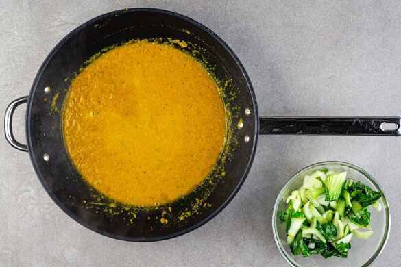 Den gesamten Pak Choi in einer großen Pfanne mit 1EL Pflanzenöl bei starker Hitze ca. 3Min. scharf anbraten und aus der Pfanne nehmen. Die Gewürzpaste mit 1TL Mehl und 1 kräftigen Prise Pfeffer in derselben Pfanne ca. 2Min. anbraten. Das Brühgewürz und 250ml Wasser hinzufügen und das Curry bei mittlerer bis niedriger Hitze 4–5Min. einköcheln lassen.