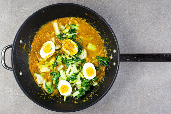 Die Eier längs halbieren, mit dem Pak Choi in die Pfanne geben und vorsichtig mit dem Curry vermengen. Mit Salz und Pfeffer abschmecken und das Curry bei starker Hitze ca. 1Min. aufkochen lassen.