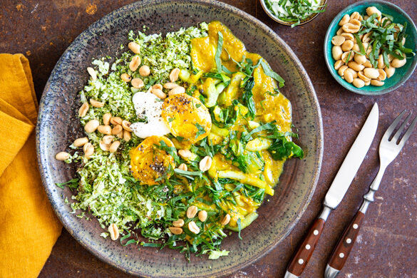 Das südamerikanische Surinam ist zwar ein kleines Land, doch die lokale Küche lässt sich mit „Oho!“ sehr treffend beschreiben: Geprägt durch unterschiedlichste Kulturen bringt sie solch aromatische Wunder hervor wie dieses außergewöhnliche Curry, das unter anderem mit gekochten Eiern und frischem Pak Choi aufwartet. Serviert wird das Curry auf Brokkolireis, würzig-knackig garniert mit Sellerieblättern und Erdnüssen. Mmmh!