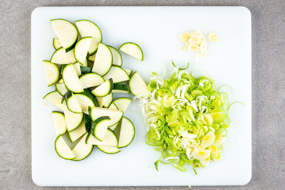 In einem mittelgroßen Topf ausreichend gesalzenes Wasser für die Pasta zum Kochen bringen. Den Lauch längs halbieren und in dünne Streifen schneiden. Die Zucchini ebenfalls längs halbieren und in dünne Scheiben schneiden. Den Knoblauch schälen und in feine Scheibchen schneiden.