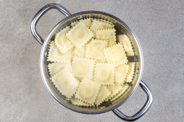 Die Pasta in das kochende Wasser geben und in 4–5Min. bissfest kochen. In ein Sieb abgießen und abtropfen lassen.