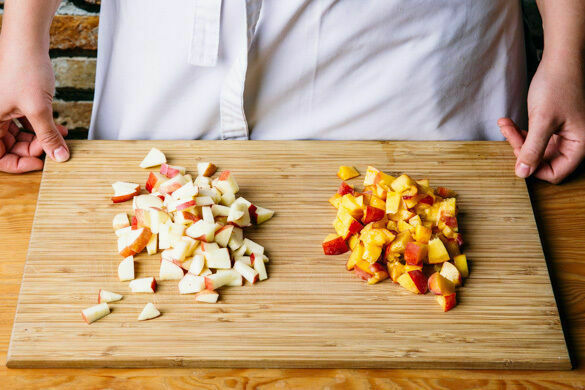 Den Backofen auf 220°C (200°C Umluft) vorheizen. Zwei Backbleche mit Backpapier auslegen. Die Nektarinen halbieren, den Stein entfernen und die Nektarinen in ca. 1cm kleine Würfel schneiden. Die Äpfel vierteln, entkernen und ebenfalls in ca. 1cm kleine Würfel schneiden. Das Obst mischen.