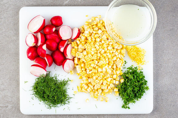 Die Radieschen halbieren. Die Hüllblätter und die die Fäden entfernen und die Maiskörner mit einem scharfen Messer vom Kolben schneiden. Den Kerbel und den Dill samt Stängeln grob schneiden. Die Zitronenschale abreiben, dann die Zitrone halbieren und auspressen.