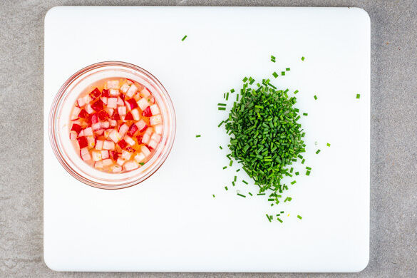 Die restlichen Radieschen grob schneiden, mit dem Zitronensaft, der 1/2 der Zitronenschale, 1EL (hellem) Essig, 1/2TL Salz sowie 1TL Zucker vermengen und beiseitestellen. Den Schnittlauch grob schneiden.