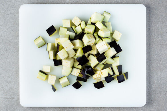 In einem großen Topf ausreichend gesalzenes Wasser für die Pasta zum Kochen bringen. Die Auberginen in ca. 1cm große Würfel schneiden.