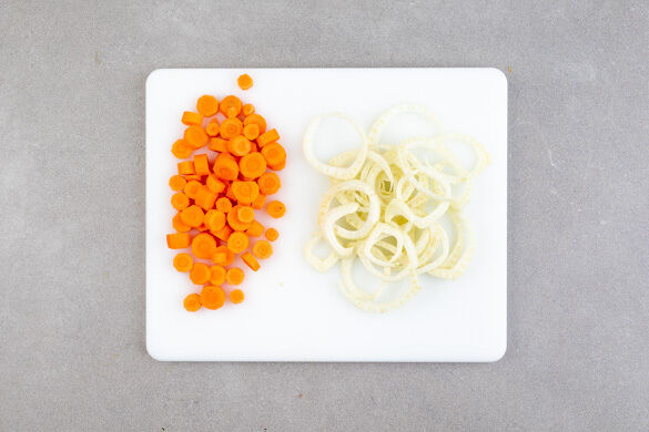 Den Fenchel halbieren, von Strunk und Grün befreien und in dünne Streifen schneiden. Die Karotten ggf. schälen und in ca. 1cm breite Scheiben schneiden