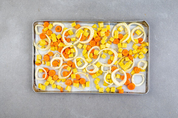 Die Kartoffeln, den Fenchel und die Karotten auf einem mit Backpapier ausgelegten Backblech mit 2EL Olivenöl und 1 kräftigen Prise Salz vermengen, gleichmäßig verteilen und 15–20Min. im Ofen rösten.