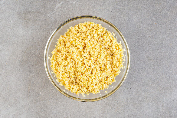 In einem mittelgroßen Topf das Brühgewürz mit 1,2L Wasser für den Bulgur zum Kochen bringen. Den Bulgur in das kochende Wasser geben und in 8–10Min. bissfest kochen. In ein Sieb abgießen und abtropfen lassen.