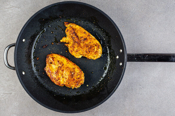 Das Fleisch trocken tupfen, jeweils horizontal halbieren, mit der Gewürzmischung einreiben und nach Belieben mit Salz und Pfeffer würzen. Das Fleisch in einer großen Pfanne mit 1EL Olivenöl bei mittlerer Hitze auf jeder Seite 3–4Min. gar braten, aus der Pfanne nehmen und abgedeckt warm halten.