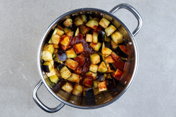 Die Auberginen mit der 1/2 der passierten Tomaten und 100ml Wasser ablöschen und bei mittlerer Hitze 10–12Min. köcheln, bis die Sauce eingedickt und das Gemüse weich ist. Das Auberginenragout mit Salz, Pfeffer und der restlichen Harissa-Gewürzmischung abschmecken.