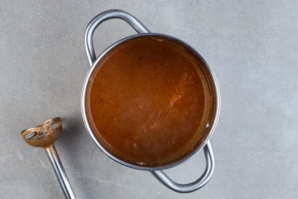 Das Gemüse im Topf mit den Bohnen samt Flüssigkeit, dem Brühgewürz und 750ml heißem Wasser ablöschen, dann abgedeckt ca. 4Min. kochen. 2–4EL des Einlegesuds oder mehr nach Geschmack zugeben und die Suppe mit einem Stabmixer fein pürieren. Ggf. etwas mehr Wasser hinzufügen.