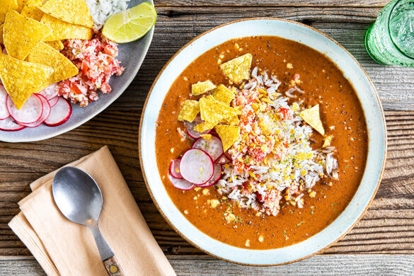 Die Suppe auf tiefe Teller verteilen. Den Reis, das Topping, die Limettenspalten und die Tortillachips separat dazu reichen, sodass jeder seine eigene Suppe verfeinern kann.