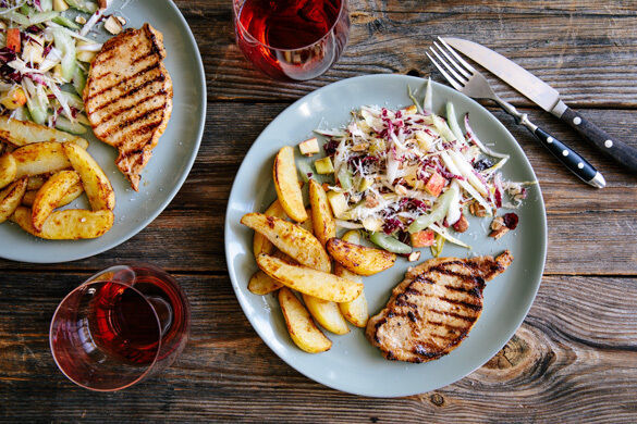 Der knackige Salat mit Apfel, Sellerie und Radicchio ist fruchtig und herb zugleich. Rauchmandeln und getrocknete Cranberrys setzen feine Akzente. Dazu servierst du saftig-zarte Schweinesteaks mit Zitrone und knusprige Kartoffeln aus dem Ofen mit Senf. Viele Aromen für ein köstliches und stimmiges Feierabendmahl, das du dir verdient hast!