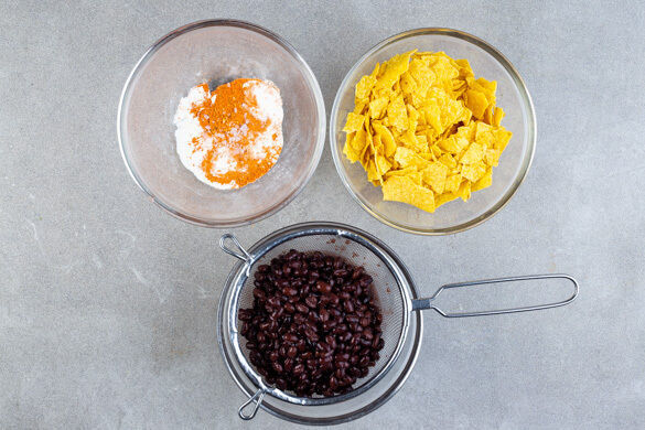 Den Backofen auf 240°C (220°C Umluft) vorheizen. Die Gewürzmischung mit 2EL Mehl und 1/2TL Salz vermengen. Die Bohnen in einem Sieb abtropfen lassen, dabei die Flüssigkeit auffangen und die Bohnen anschließend kalt abspülen. Die Tortillachips grob zerkrümeln.