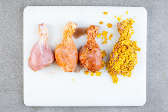 Das Fleisch von der Haut befreien, trocken tupfen und mit dem Gewürz-Mix einreiben. Das Fleisch anschließend in der Bohnenflüssigkeit wenden, überschüssige Flüssigkeit kurz abtropfen lassen und das Fleisch in den Tortillachips wenden. Die Tortillachips mit den Fingern festdrücken und das Fleisch auf ein mit Backpapier ausgelegtes Backblech legen.