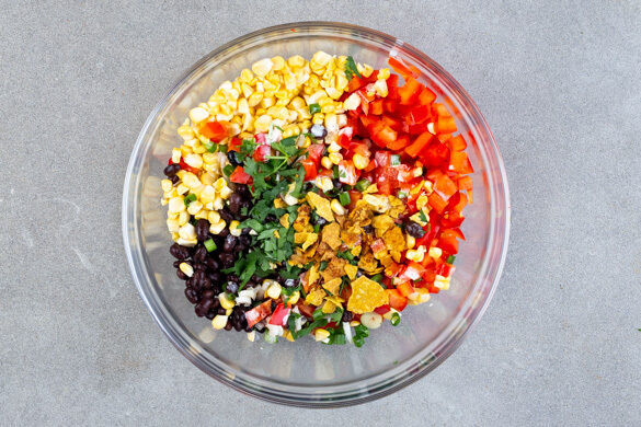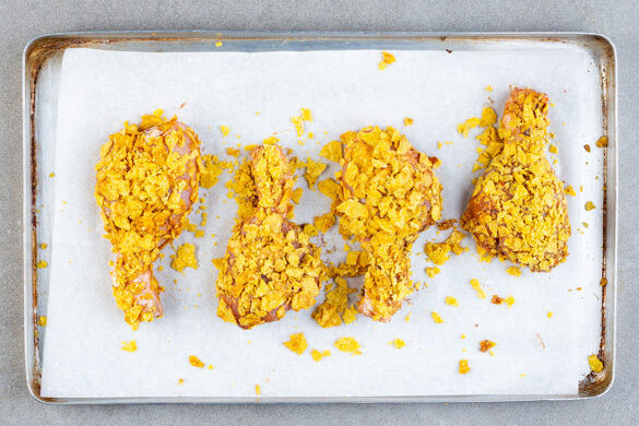 Clever, clever diese Hähnchenkeulen! Das zarte Fleisch wird nämlich knusprig paniert und zwar mit zerkrümelten Mais-Chips! Dazu gibt es einen kunterbunten Salat aus schwarzen Bohnen, Paprika und frischem Mais in einem cremigen Limettendressing mit duftendem Koriander. Und weil wir Zero Waste lieben, dürfen übrige gebackene Mais-Chips auch mit in die Salatschüssel hüpfen und dort für ordentlich Knusperspaß sorgen.