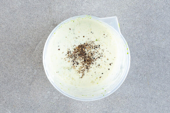 Die Limettenschale abreiben, dann die Limette halbieren und auspressen. Die 1/2 des Limettensafts unter den Salat mengen. Die Limettenschale, die Korianderstängel und 3EL Mayonnaise in einem hohen Gefäß mit einem Stabmixer zu einem cremigen Dressing pürieren, mit dem restlichen Limettensaft sowie Salz und Pfeffer abschmecken und mit dem Salat vermengen.