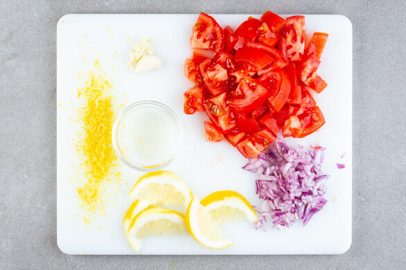 Den Backofen auf 230°C (210°C Umluft) vorheizen. Den Knoblauch schälen, eine Zehe sehr fein würfeln oder fein reiben. Die Zwiebel schälen und eine Hälfte fein würfeln, die andere Hälfte wird nicht benötigt. Die Zitronenschale abreiben und die Zitrone halbieren, eine Hälfte auspressen, die andere Hälfte in Spalten schneiden. Die Tomaten grob schneiden.
