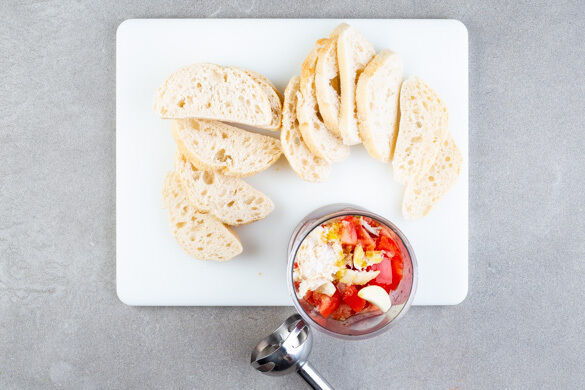 Die Brötchen in ca. 1cm dicke Scheiben schneiden. Ein Endstück in kleine Stücke schneiden. Die Brötchenstücke mit den Tomaten, der ganzen Knoblauchzehe, 3EL Olivenöl und 1 kräftigen Prise Salz in einem hohen Gefäß mit einem Stabmixer glatt pürieren. Mit Salz und 1/2TL (hellem) Essig abschmecken und ggf. 1EL Wasser zugeben, bis die Suppe eine cremige Konsistenz hat.