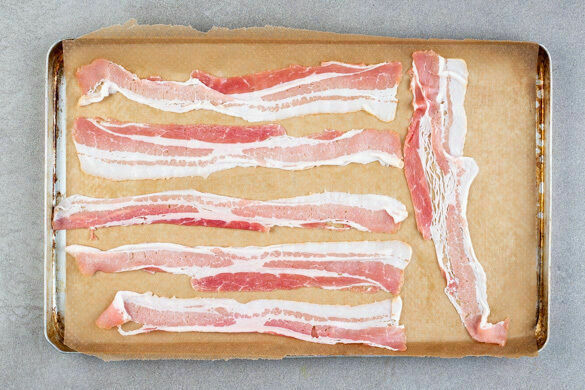 Die Baconscheiben auf einer Seite eines mit Backpapier ausgelegten Backblechs verteilen und im mittleren Teil des Ofens in 10–15Min. knusprig backen.