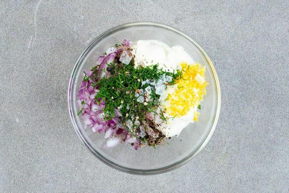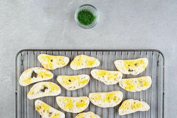 Die Brötchenscheiben mit 2EL Olivenöl bepinseln und auf einem Backrost im oberen Teil des Ofens in 3–5Min. goldbraun backen. Die Dillspitzen von den Stängeln zupfen und fein schneiden.