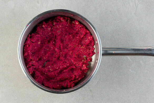 Die Rote Bete schälen und mit einer Küchenreibe grob raspeln. Die Kichererbsen in ein Sieb abgießen. Die Dillspitzen grob, die Dillstängel fein schneiden. Die Rote Bete, die Kichererbsen und die Dillstängel in einem kleinen Topf mit einem Stabmixer pürieren, dann 6–8EL Mehl, 1TL Salz und 2 kräftige Prisen Pfeffer unterkneten.