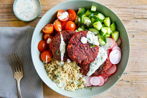 Bunt und lecker, das ist dein heutiges Abendessen: Auf lockerer Quinoa servierst du eingelegte Radieschen, knackig-frische Gurken und Kirschtomaten sowie als Highlight Falafeln mit Rote Bete und Dill. Dazu ein cremiger Joghurtdip mit Knoblauch ... mmh!