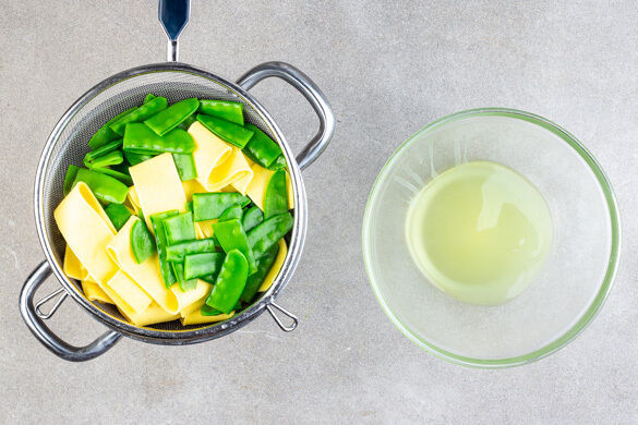 Die Lasagneblätter der Länge nach in 4 Streifen schneiden, in das kochende Wasser geben und in 7–8Min. bissfest kochen. In den letzten 2Min. der Garzeit die Zuckererbsen mitkochen. 200ml Pastawasser abschöpfen, dann die Pasta in ein Sieb abgießen und abtropfen lassen.