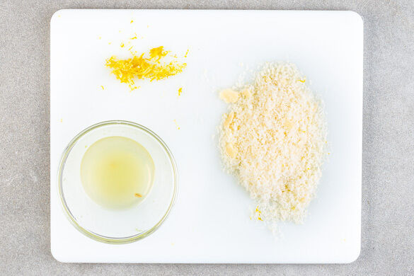 Die Zitronenschale abreiben, dann die Zitrone halbieren und auspressen. Den Käse fein reiben.