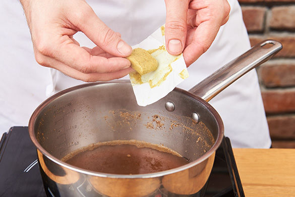 Den Umluftbackofen auf 220°C vorheizen. In einem mittleren Topf 600ml Wasser, den Brühwürfel und das Ras el Hanout Gewürz zum Kochen bringen.
