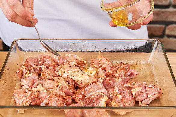 Die Hähnchenschenkel in ca. 2-3cm große Stücke schneiden und mit Salz, dem Paprikapulver und 1-2EL Olivenöl vermengen. In eine feuerfeste Form geben und im Ofen für ca. 15-20Min. knusprig garen.