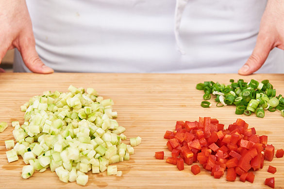 Inzwischen die Gurke schälen, der Länge nach vierteln und das Kerngehäuse heraus schneiden, dann die Gurke in möglichst feine Würfel schneiden. Die Paprika ebenfalls vierteln, vom Kerngehäuse befreien und in feine Würfel schneiden. Die Lauchzwiebel in feine Streifen schneiden.