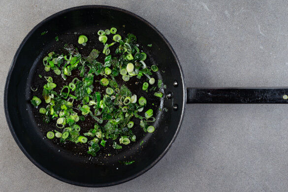 Die Minzeblätter von den Stängeln zupfen und grob schneiden. Die Lauchzwiebeln in dünne Ringe schneiden. Die Minze und die Lauchzwiebeln in einer kleinen Pfanne mit 6EL Olivenöl und 1–2 Prisen Salz bei niedriger Hitze 4–5Min. braten, bis die Lauchzwiebeln weich sind.