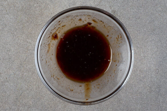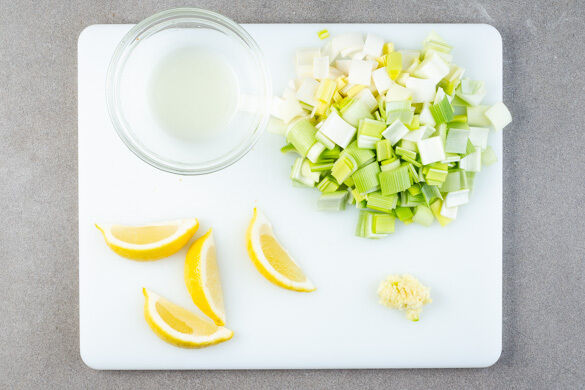 In einem Wasserkocher 1,5L Wasser zum Kochen bringen. Den Knoblauch schälen und fein würfeln. Eine Zitrone halbieren und auspressen, die andere Zitrone in Spalten schneiden. Den Lauch jeweils längs vierteln und in ca. 1cm breite Streifen schneiden.