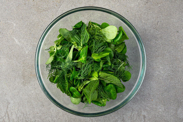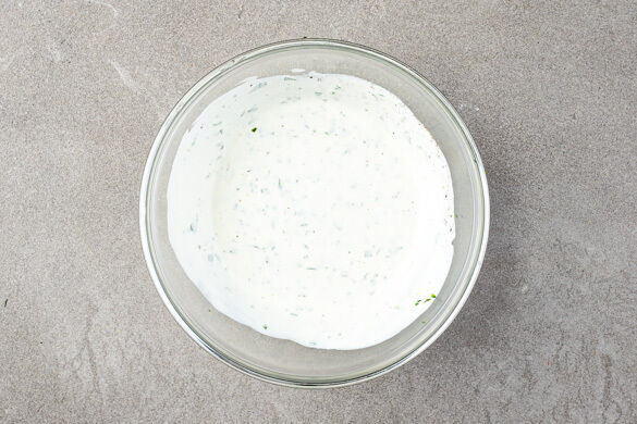 Die Minzeblätter von den Stängeln zupfen, dann fein schneiden. Den Dill samt Stängeln ebenfalls fein schneiden. 2–3EL Joghurt mit 1EL hellem Essig, 1–2EL Wasser, 1TL Kreuzkümmel, 1/2TL Sumach sowie je 1 Prise Salz und Pfeffer verrühren. Ggf. mit mehr Salz und Pfeffer abschmecken.