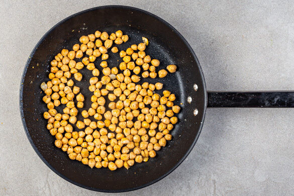 Die Kichererbsen in einem Sieb mit kaltem Wasser abspülen und abtropfen lassen, dann in einer mittelgroßen Pfanne mit 1EL Olivenöl bei mittlerer Hitze 6–8Min. unter Rühren anbraten, bis sie zu bräunen beginnen. Die Kichererbsen mit einer Schaumkelle aus der Pfanne nehmen, mit Salz und Pfeffer abschmecken und beiseitestellen.