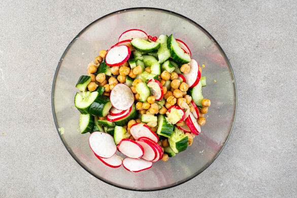 Die Radieschen in dünne Scheiben schneiden. Die Gurke auf ein Brett legen und mit einer schweren Pfanne oder einem Nudelholz so lange schlagen, bis die Gurke auf- bzw. in Stücke bricht. Dann grob in mundgerechte Stücke schneiden und mit den Radieschen sowie den Kichererbsen vermengen.