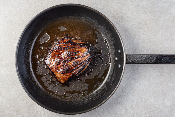 Das Fleisch in der Pfanne mit 1EL Olivenöl bei starker Hitze auf der Fettseite 2–4Min. scharf anbraten. Wenden und weitere 2–4Min. braten, je nach Dicke des Fleisches. Die Hitze reduzieren und das Fleisch noch 1–3Min. abgedeckt garen, je nachdem, ob es medium oder durch sein soll. Das Fleisch abgedeckt auf einem Teller ruhen lassen.