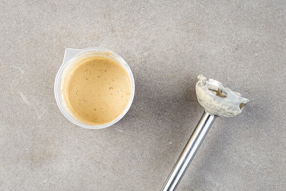 Das Tahini, den Reisessig, den restlichen Zitronensaft, das restliche Sesamöl und 1EL Wasser in einem hohen Gefäß mit einem Stabmixer zu einem glatten Dressing pürieren. Mit Salz und Pfeffer abschmecken.