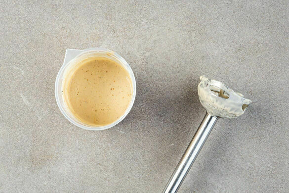 Das Tahini, den Reisessig, den restlichen Zitronensaft, das restliche Sesamöl und 2EL Wasser in einem hohen Gefäß mit einem Stabmixer zu einem glatten Dressing pürieren. Mit Salz und Pfeffer abschmecken.