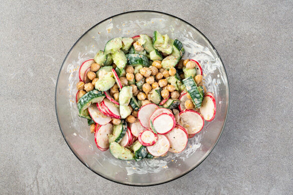 Die Radieschen in dünne Scheiben schneiden. Die Gurken auf ein Brett legen und mit einer schweren Pfanne oder einem Nudelholz so lange schlagen, bis die Gurken auf- bzw. in Stücke brechen. Dann grob in mundgerechte Stücke schneiden und mit den Radieschen sowie den Kichererbsen vermengen.
