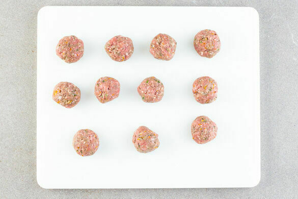 Die Rosmarinnadeln von den Stängeln zupfen und fein schneiden. Den Knoblauch schälen und fein würfeln. Das Hackfleisch mit dem Knoblauch, dem Rosmarin, der Orangenschale, 1/2TL Salz sowie 1 kräftigen Prise Pfeffer verkneten und mit befeuchteten Händen zu walnussgroßen Bällchen formen.