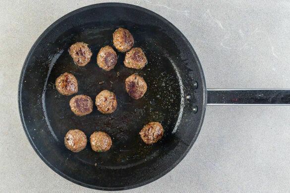 Die Hackbällchen in einer großen Pfanne bei mittlerer Hitze mit 2EL Olivenöl in 8–10Min. rundum goldbraun und gar braten.