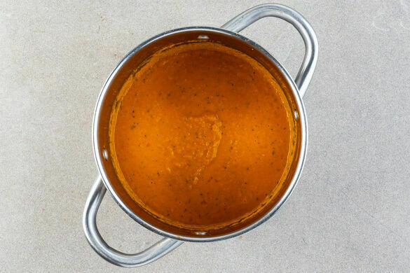 Die Zwiebeln und die Karotten in einem großen Topf mit 1EL Olivenöl und 1 Prise Salz bei mittlerer Hitze ca. 4Min. braten. Mit den passierten Tomaten, dem Brühgewürz, dem Orangensaft und 800ml heißem Wasser ablöschen und zum Kochen bringen. Die Suppe ca. 10Min. kochen, bis die Karotten weich sind.