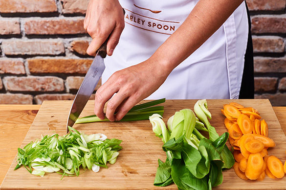 Die Karotten schälen und in dünne, schräge Scheiben schneiden. Den Pak Choi vom Strunk befreien und längs vierteln. Die Lauchzwiebel schräg in feine Ringe schneiden.